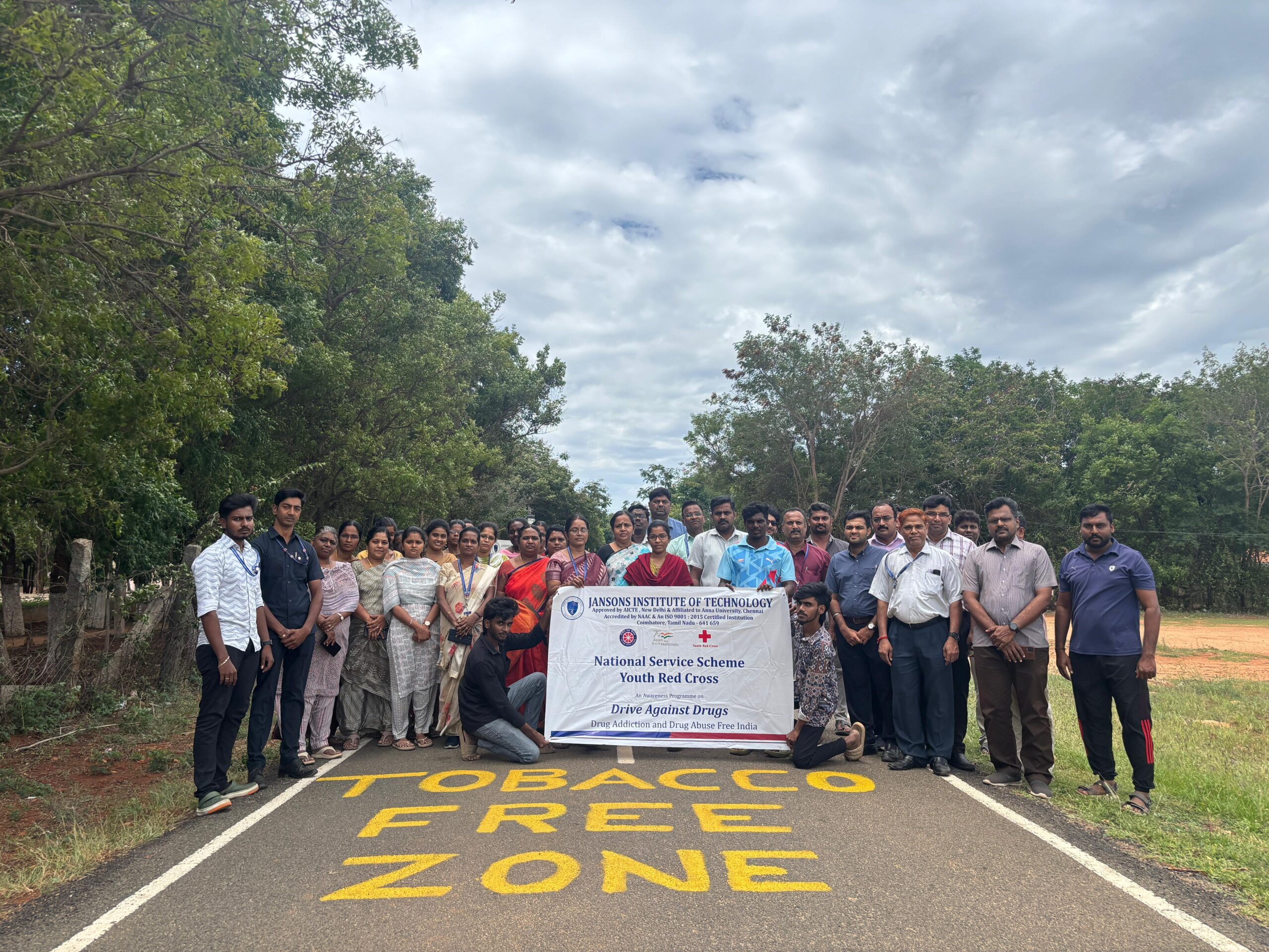 The event Tobacco Free Zone was organized on June 13, 2025, from 3:00 PM to 4:00 PM at the Jansons Institute of Technology campus. Conducted by the National Service Scheme (NSS) in association with the Youth Red Cross (YRC) and the Anti-Drug Club (ADC), the programme aimed to raise awareness about the harmful effects of tobacco consumption and encourage a healthier lifestyle. As part of the initiative, a tobacco-free zone line was created at both entrances of the campus, symbolizing the institution’s commitment to maintaining a clean, safe, and healthy environment. Faculty, students, and volunteers actively participated in spreading the message of “Say No to Tobacco,” emphasizing the importance of collective responsibility in preventing its use.The programme concluded with a strong reminder of the health risks associated with tobacco and the need to build a tobacco-free society. The event successfully promoted awareness and reinforced the commitment towards a healthier campus.