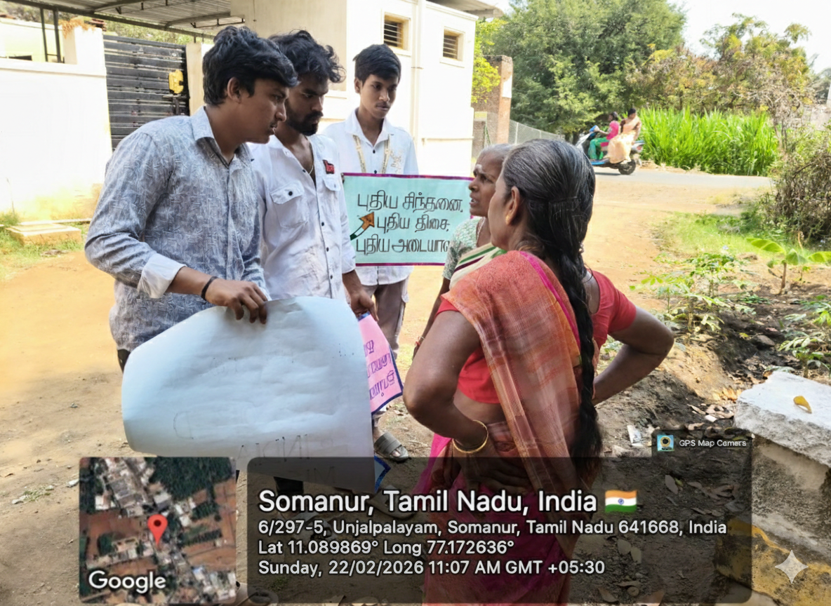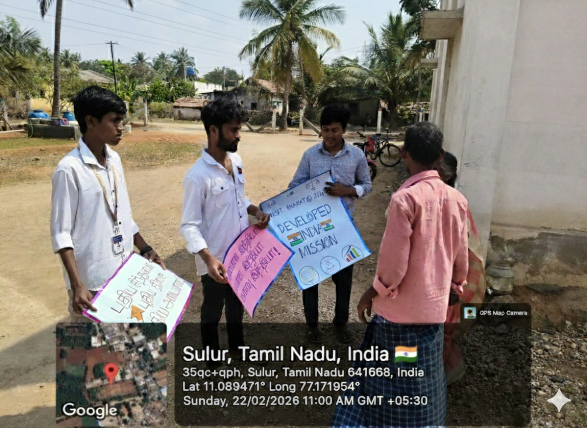 The “Viksit Bharat – Awareness Camp” was organized by the National Service Scheme on 22.02.2026 at Unjapalayam Village. The program began at 03.00 PM with a welcome address delivered by Mr. Nitish R S, II CSE. This was followed by an informative speech about Viksit Bharat delivered by Dr. K. Senthamil Selvan, Programme Officer, National Service Scheme, who explained the vision of building a developed and self-reliant India through collective social responsibility and community participation. After the speech, NSS volunteers carried out awareness activities in different areas of the village including the south, north, east, and west sides of Unjapalayam Village. The volunteers interacted with villagers and explained the importance of education, sanitation, environmental protection, and active citizen participation in national development. The campaign encouraged villagers to contribute positively toward the growth of the nation. The program concluded with a vote of thanks delivered by Mr. Rohith M, II CSE.